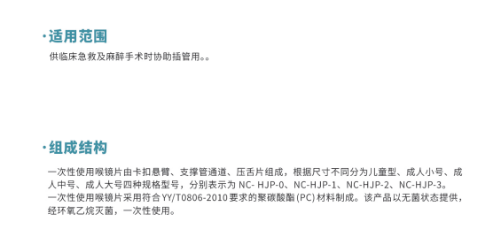 一次性使用喉鏡片由卡扣懸臂、支撐管通道、壓舌片組成。根據(jù)尺寸不同分為兒童型、成人小號(hào)、 成人中號(hào)、成人大號(hào)四種規(guī)格型號(hào),分別表示為 NC-HJP-0、NC-HJP-1、NC-HJP-2、NC-HJP-3.