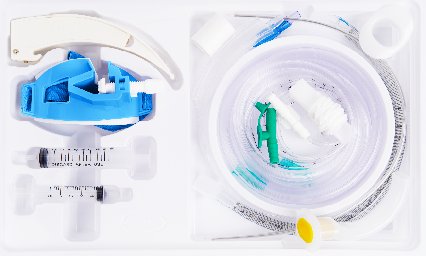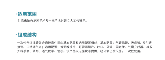 一次性氣道插管聯(lián)合麻醉套件是由基本配置和選用配置組成,基本配置:氣管插管、吸痰管、吸引連接管、口咽通氣道;選用配置:普通喉鏡片、可視喉鏡片、咬口、牙墊、固定架、氣囊充起器、橡膠外科手套、紗布、透氣膠帶、管芯。該產(chǎn)品以無菌狀態(tài)提供,經(jīng)環(huán)氧乙烷滅菌。一次性使用。