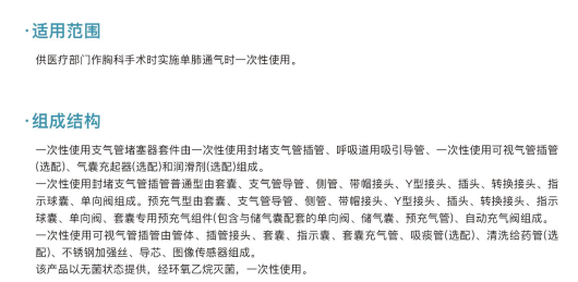 一次性使用支氣管堵塞器套件由一次性使用封堵支氣管插管、呼吸道用吸引導(dǎo)管、一次性使用可視氣管插管(選配)、氣囊充起器(選配)和潤滑劑(選配)組成。產(chǎn)品供醫(yī)療部門作胸科手術(shù)時(shí)實(shí)施單肺通氣時(shí)一次性使用。