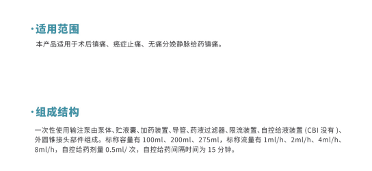 一次性使用輸注泵由泵體、貯液囊、加藥裝置、導(dǎo)管、藥液過濾器、限流裝置、自控給液裝置(CBI 沒有)、外圓錐接頭部件組成。標(biāo)稱容量有 100ml、200ml、275ml,標(biāo)稱流量有 1ml/h、2ml/h、4ml/h、8ml/h.
