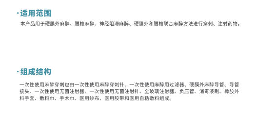 一次性使用麻醉穿刺包由一次性使用麻醉穿刺針、一次性使用麻醉用過濾器、硬膜外麻醉導(dǎo)管、導(dǎo)管接頭、一次性使用無菌注射器、一次性使用無菌注射針、全玻璃注射器、負(fù)壓管、消毒液刷、橡膠外科手套、敷料巾、手術(shù)巾、醫(yī)用紗布、醫(yī)用膠帶和醫(yī)用自粘敷料組成。