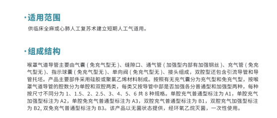 喉罩氣道導(dǎo)管主要由氣囊(免充氣型無)、縫隙口、通氣管(加強型內(nèi)部有加強鋼絲)、充氣管(免充氣型無)、指示球囊(免充氣型無)、單向閥(免充氣型無)、接頭等組成,雙腔型還包含引流導(dǎo)管和導(dǎo)管托坯。
