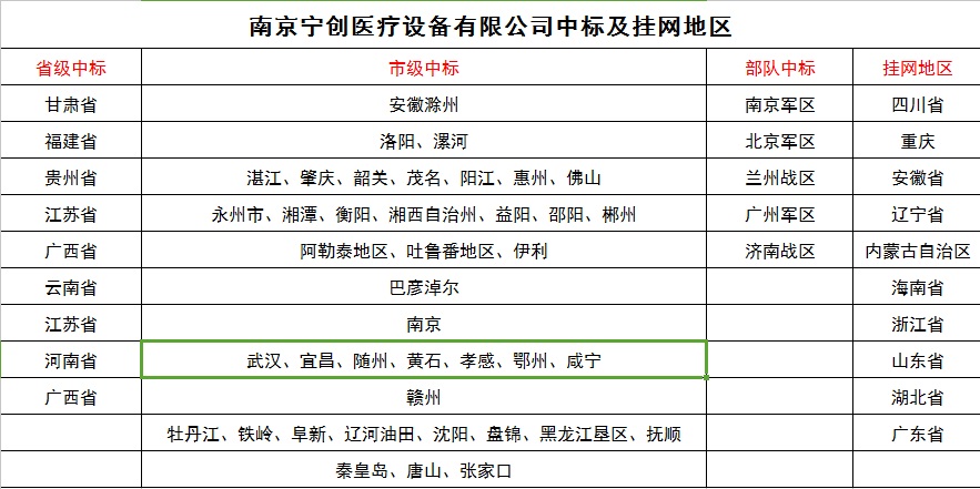 南京寧創(chuàng)醫(yī)療設(shè)備有限公司產(chǎn)品中標(biāo)及掛網(wǎng)地區(qū)一覽表